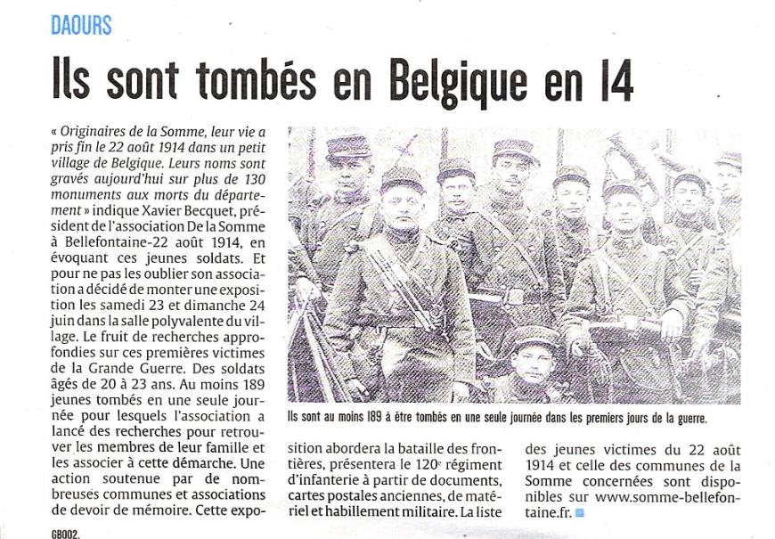 L’exposition départementale « De la Somme à Bellefontaine » se prépare. Les 23 et 24 juin 2018, dans la salle polyvalente de Daours, ce sont 189 bouts de vie qui seront présentés. Et même bien au-delà puisque les organisateurs ne se limiteront pas à évoquer ceux de la Somme qui ont été tués le 22 août 1914 à Bellefontaine, mais également ceux qui y ont été blessés et ceux qui en ont survécu. La guerre a brisé ces vies, alors que chacune d’entre elles aurait mérité d’être vécue plus longtemps. C’est à travers la mise en valeur des vies de ces jeunes hommes, au début du XXe siècle, que les organisateurs souhaitent exercer au mieux le devoir de mémoire, pour toutes les générations d’aujourd’hui.