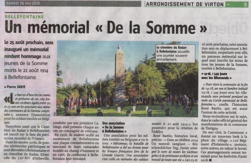 Dans son édition du 26 mai 2018, le journal « L’AVENIR DU LUXEMBOURG » a relayé l’information annonçant l’inauguration du mémorial, à Bellefontaine, pour rendre hommage aux 189 jeunes hommes originaires de la Somme tués le 22 août 1914 sur le territoire du village.