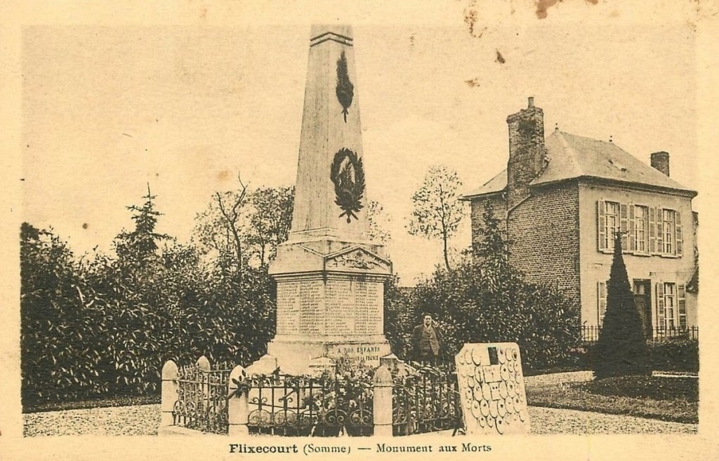 Quand Clotaire revenait, en famille, voir ses parents, il ne manquait jamais de passer devant le monument aux morts de Flixecourt, au bord de la route Amiens-Abbeville, et de s’y arrêter. En une fraction de seconde, ses yeux savaient exactement où ils devaient se poser, malgré la longue liste des « Morts pour la France » de la commune. Clotaire trouvait toujours immédiatement le nom de son frère, Octave LECLERCQ. Et alors, sa tête s’emplissait d’images heureuses de Belloy, de Vignacourt, de la Rue Malakoff, de la boulangerie de la Rue Thiers, de l’usine Saint. Une époque où la guerre ne lui avait pas encore pris son frère.