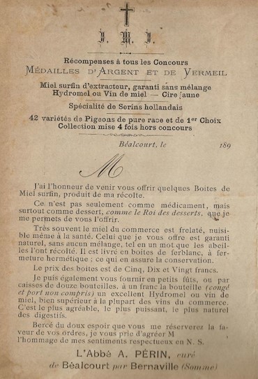 A Béalcourt, il y a un curieux personnage. L’abbé Perin, le curé du village, est un commerçant qui expédie sa production dans la France entière. Fabricant de miel « garanti sans mélange », d’hydromel et de cire jaune, il dispose également d’une incomparable volière. Il déclare avoir 42 variétés de pigeons pure race et « de 1er choix ». Il est également reconnu comme un spécialiste des serins hollandais. Un curieux personnage pour un curieux monument. L’église Notre-Dame de Mons est située à l’extérieur du village, à plus de 400 mètres des habitations. Chaque dimanche, les paroissiens se retrouvent en cortège pour se rendre à l’office. L’église a été reconstruite au XVIe siècle sur l’emplacement de l’ancienne. A l’époque, elle n’était pas celle de Béalcourt, qui n’était qu’un hameau dans les marais de l’Authie, mais celle de Mons, le chef-lieu. Village qui a été entièrement détruit lors d’une invasion des Espagnols.