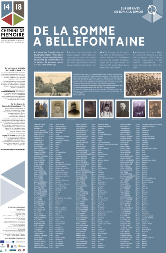 Son nom est inscrit sur le panneau-mémorial inauguré à Bellefontaine en août 2018 par l’association « De la Somme à Bellefontaine ».