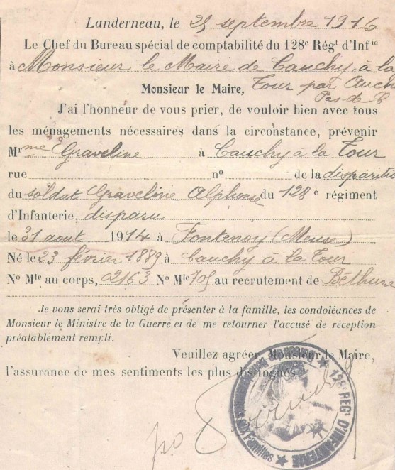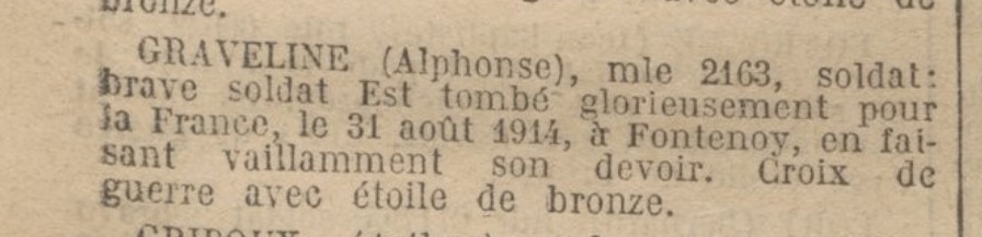 Le nom de son frère cadet, Alphonse GRAVELINE, est inscrit sur le monument aux morts de Cauchy-à-la-Tour.