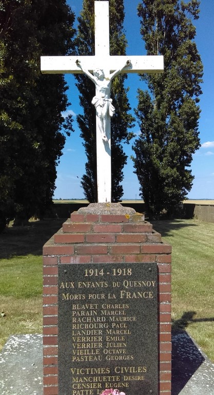 Sur le petit monument aux morts du Quesnoy-en-Santerre sont inscrits les noms de trois des garçons qui ont partagé l’enfance de Jules. Les noms de Charles BLAVET, de Marcel PARAIN et de Paul RICBOURG. Le nom de Joseph MOIRET est inscrit sur le monument de Davenescourt, village où sa mère s’était installée depuis peu, à quelques kilomètres du Quesnoy-en-Santerre.