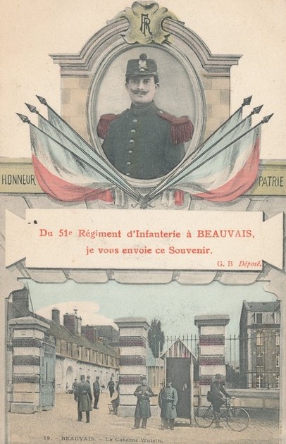 L’arrivée du service militaire dans la vie de Marcel est peut-être une chance pour lui. A défaut d’être payé, il sera nourri et logé gratuitement pendant deux années. Il quitte Amiens le 1er octobre 1913 pour rejoindre le 51e Régiment d’Infanterie de Beauvais.