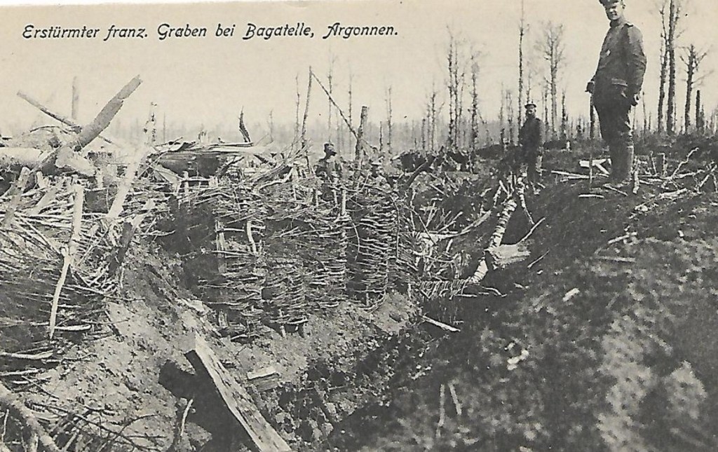 Après la Bataille de la Marne, début septembre 1914, le 120e s’installe en forêt d’Argonne. Assurer la relève dans les tranchées. Surveiller. Lancer des offensives. Résister aux attaques. Et encore surveiller. Et attendre. Attendre. Attendre que le jour arrive. Attendre qu’on vienne livrer la soupe.  Attendre l’ordre de se replier. Attendre que la pluie prenne fin. Quatre à cinq jours de ce régime, suivis de deux à trois jours de repos, à l’arrière, pour tenter de récupérer le sommeil perdu, en espérant trouver une forme de paix. Avant de repartir en première ligne…