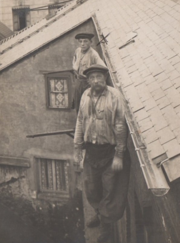 Contrairement à tous ses copains qui en grandissant ont une activité agricole, Georges suit la voie tracée par son père. Il devient apprenti-couvreur. C’est bien sûr avec son père qu’il apprend le métier. Le père et le fils connaissent presque tous les villages et tous les chemins vicinaux du secteur. On ne refuse jamais un chantier, même s’il faut parcourir de nombreux kilomètres à pied pour s’y rendre, en poussant une voiture à bras.