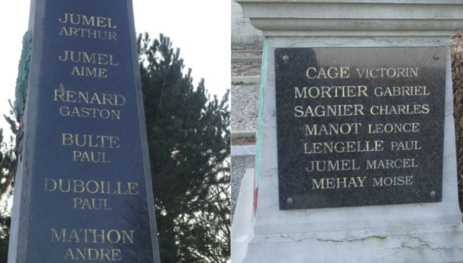 Le nom d’Arthur JUMEL et ceux des frères Aimé et Marcel JUMEL sont inscrits sur le monument aux morts de Franvillers.