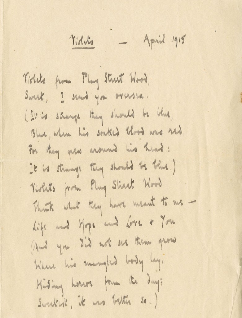 Le poète qu’est devenu Roland écrit alors un poème sur les violettes du bois de Plug Street (déformation de Ploegsteert), des fleurs qui ont conservé leur couleur bleue dans une terre tellement arrosée de sang.