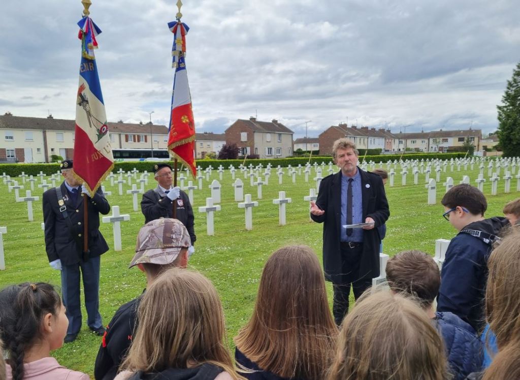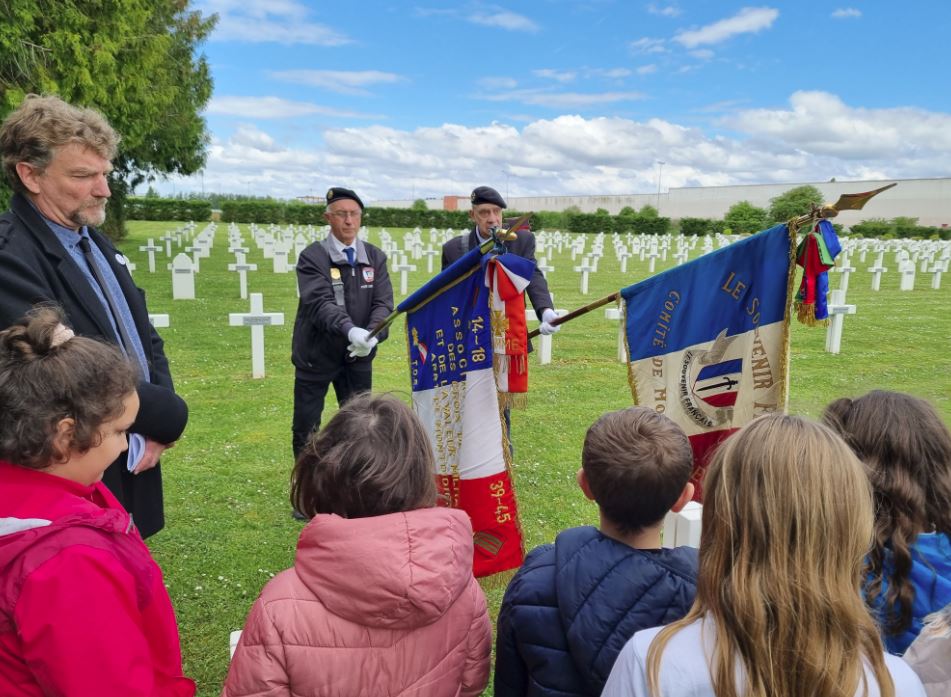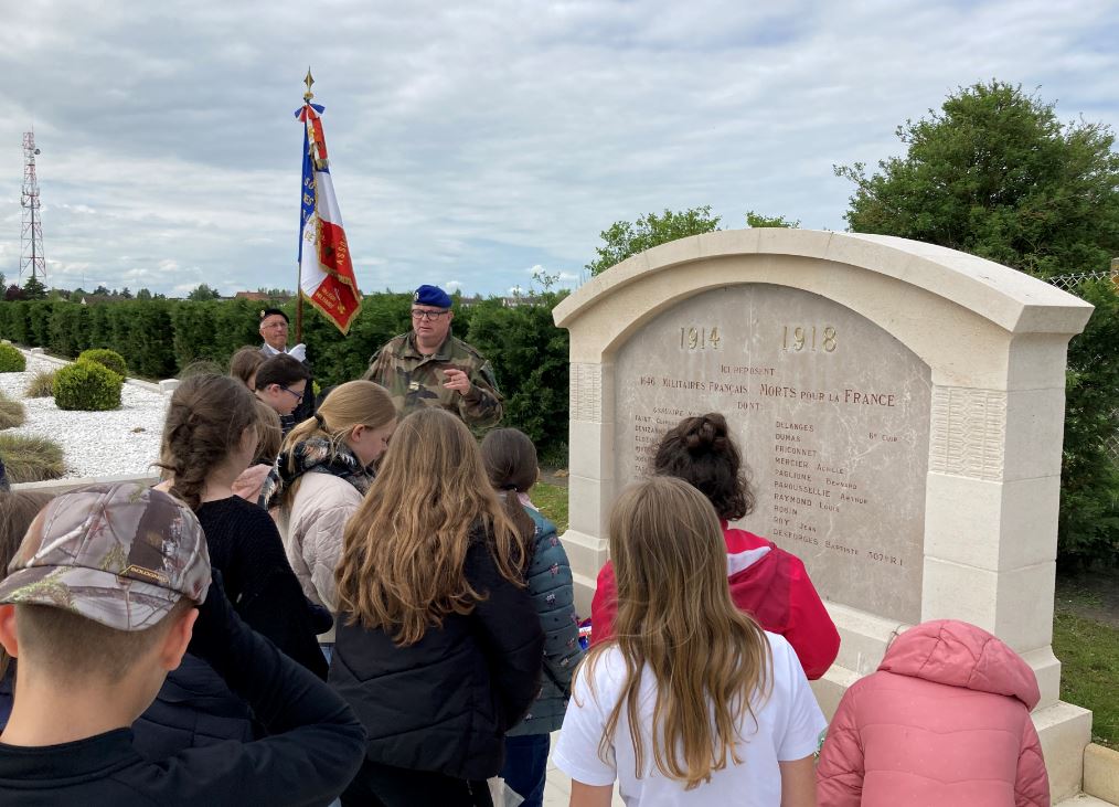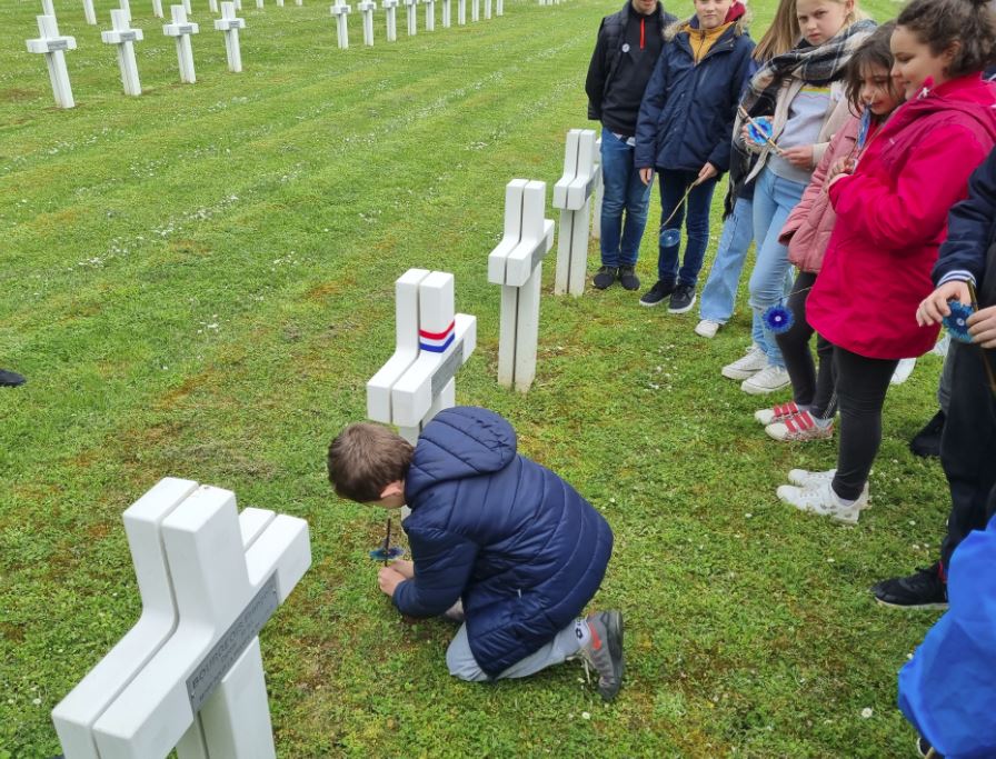 Après une présentation de la nécropole par le lieutenant-colonel ROUSSEL, les enfants accompagnés par leur enseignante, par deux porte-drapeaux du Souvenir Français de Montdidier et par le représentant de l’association De la Somme à Bellefontaine, se sont rendus sur les tombes des jeunes hommes dont les parcours de vie avaient été évoqués le matin en classe.