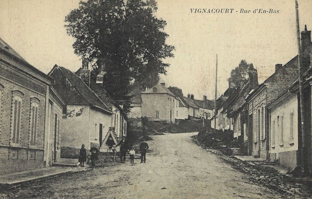 Les filles, Marthe et Marie ROUVILLAIN, avaient quitté la commune avant la guerre. Marthe a poursuivi sa vie près d’Amiens et Marie est partie dans l’Aisne. Louis ROUVILLAIN et ses parents sont restés à Vignacourt, commune où ils s’étaient réfugiés, pour y exploiter en famille une ferme. Louis a épousé une jeune fille de Vignacourt, Marcelle DUBOILLE avec laquelle il a eu trois garçons, Maurice, Paul et Marceau. Le nom de la voie à Vignacourt où était installée la ferme était la rue d’En-Bas… Comme à Mesnil…