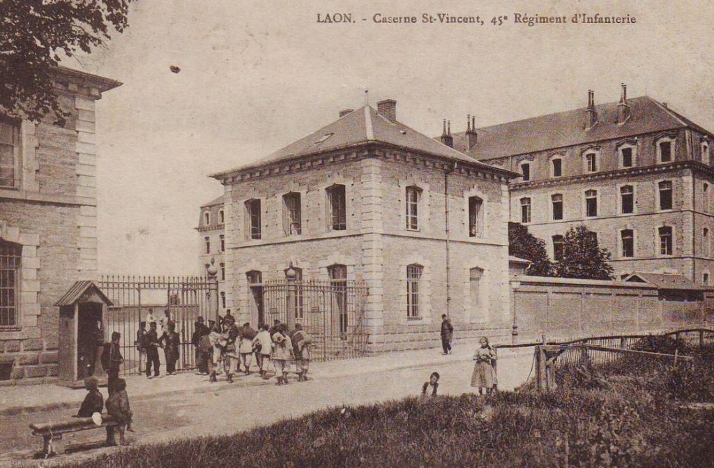Au début du XXe siècle, les obligations du service militaire ne se limitent pas au service actif. Chaque homme est susceptible d’être rappelé de nombreuses années après avoir terminé le service actif. Des périodes de recyclage sont également obligatoires. René DUBUQUOY est convoqué à l’été 1913 pour la première de ces périodes de 3 semaines d’instruction. Il doit se rendre à la caserne Saint-Vincent à Laon dans l’Aisne le 29 août 1913. Il y retrouve son copain breton, Joseph LEHÉ. Même si les gars de la Somme sont plus nombreux à Laon qu’ils ne l’étaient dans la caserne Marion de Remiremont, ceux du canton de Nesle sont bien rares. Il y a quelques têtes connues : Abel BRUNET de Pargny, Emile HOUPPIN de Voyennes, Michel DELANCHY de Nesle…