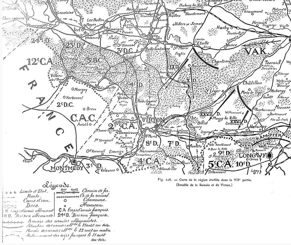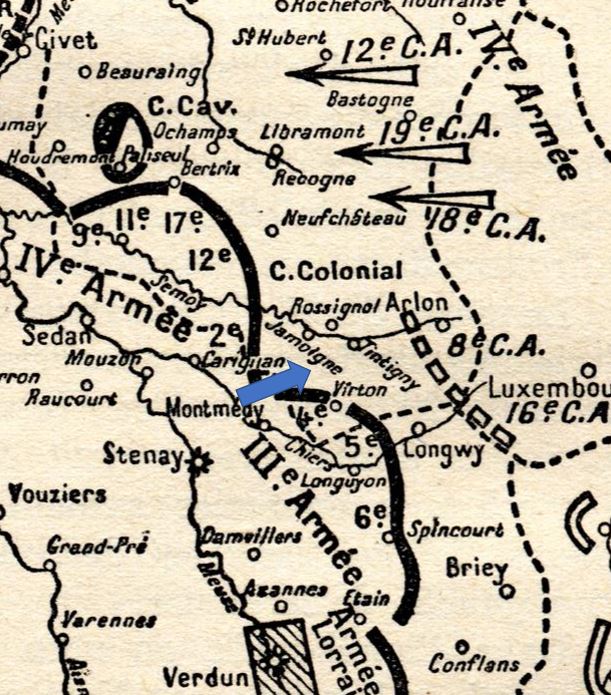 A 4h30, les 9e et 18e bataillons de chasseurs à pied quittent Thonne-la-Long, et à 5 heures, les hommes du 120e régiment d’infanterie quittent Meix-devant-Virton. L’objectif fixé aux troupes de la 87e brigade du général Cordonnier (120e RI, 9e BCP, 18e BCP et quelques batteries du 42e régiment d’artillerie) est d’atteindre au plus tôt le village de Bellefontaine pour franchir ensuite la Semois et pourchasser les Allemands.