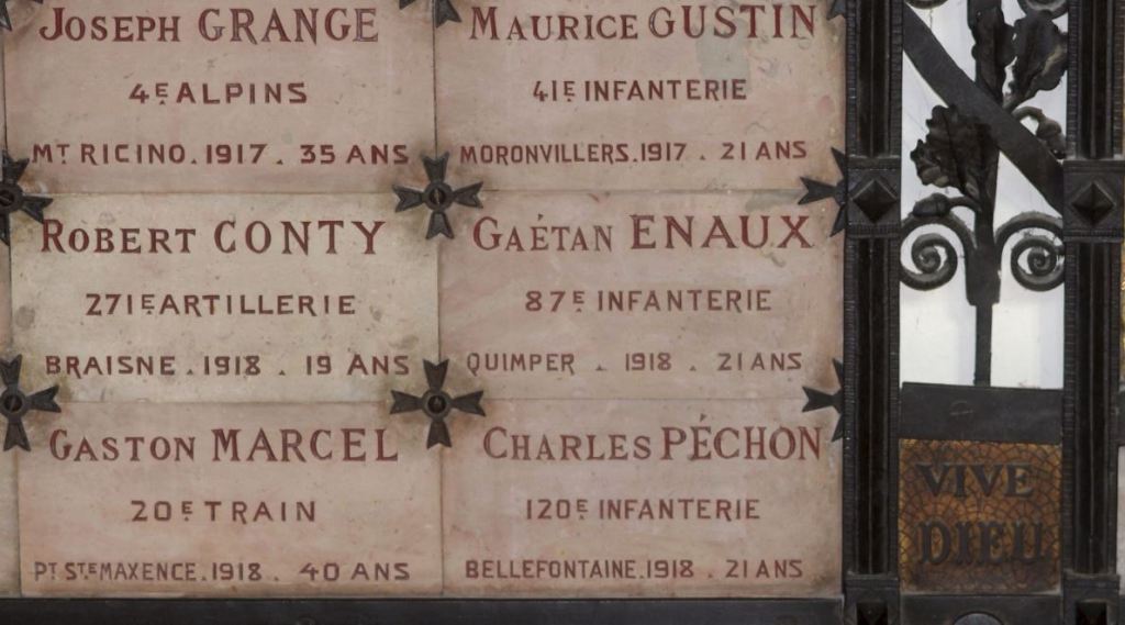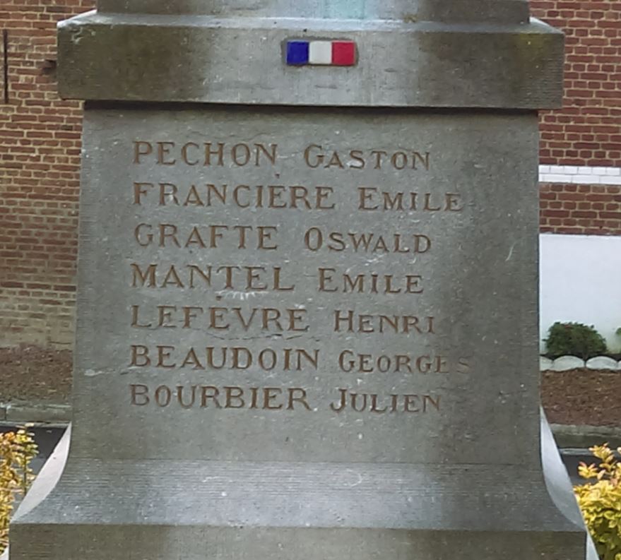 Si à Enghien-les-Bains, sur le monument aux morts comme sur la plaque commémorative de l’église, c’est le premier prénom, Charles, qui a été gravé avec le nom PÉCHON, à Contoire-Hamel, où personne n’avait oublié le fils du contremaître en bonneterie, c’est le prénom usuel de Gaston qui est inscrit.