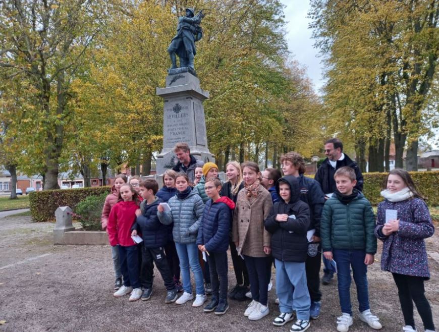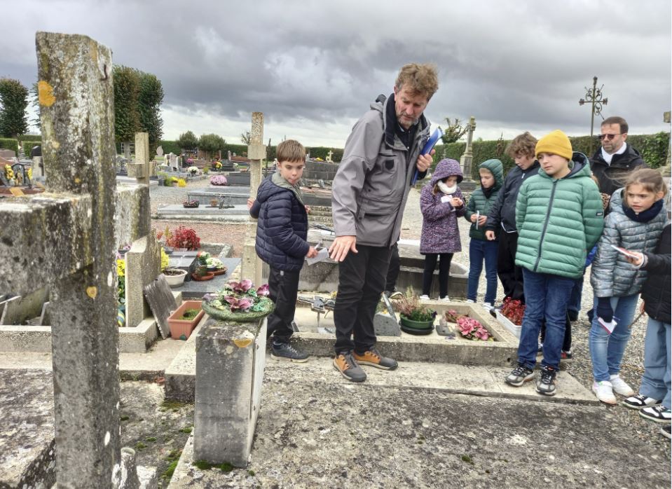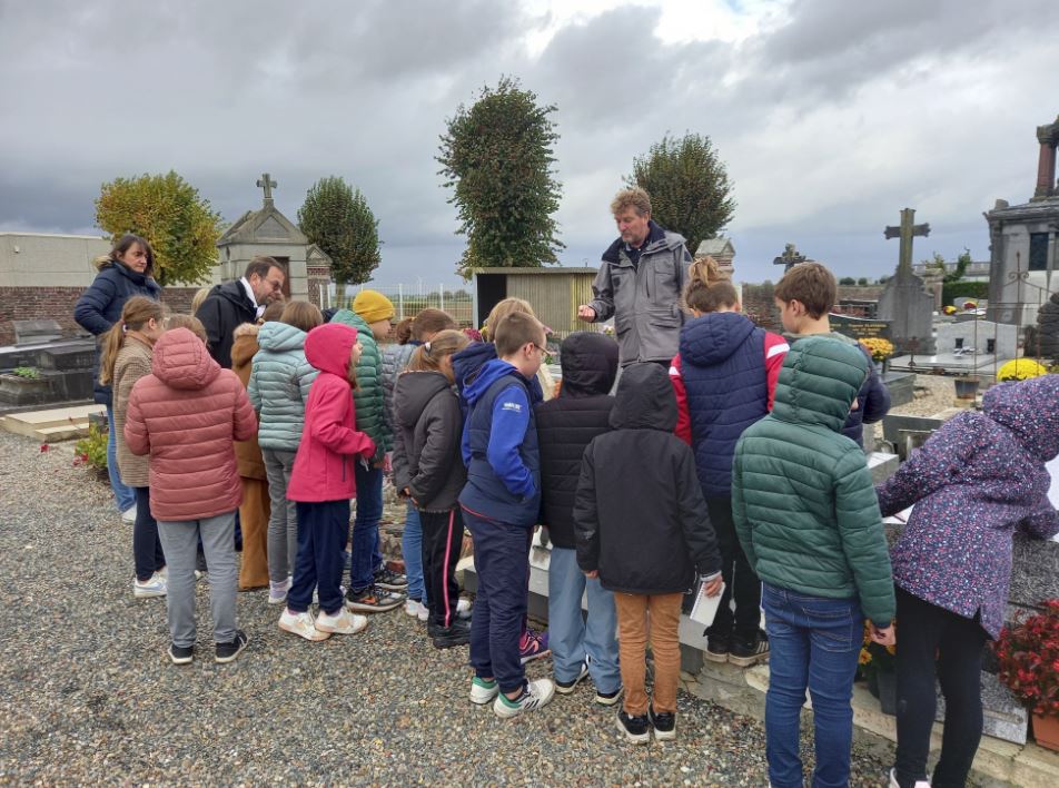 Une visite au cimetière communal a permis de localiser les tombes des soldats Morts pour la France, qu’ils soient originaires du village ou qu’ils aient été tués à proximité. Les enfants ont déposé des bleuets en signe d’hommage pour chaque victime. Un moment particulier a été consacré à Clotaire DOBEL, mort dans une prison en Algérie le 9 mai 1919. Son corps repose au cimetière d’Arvillers.