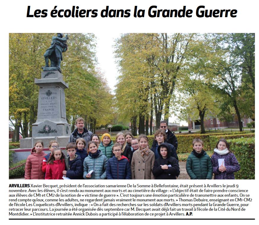 Ils ont aussi appris qu’Arvillers disposait d’une fabrique de sucre et d’une gare sur la ligne de chemin de fer Albert-Montdidier. En 1900, dans la commune, il y avait un médecin, un pharmacien, un boucher, deux boulangers, deux instituteurs , un cantonnier, un garde-champêtre, un facteur et un curé desservant. Des parcours de vie de jeunes garçons du village qui avaient près de 20 ans quand la guerre a été déclarée, en août 1914, ont été racontés aux élèves.