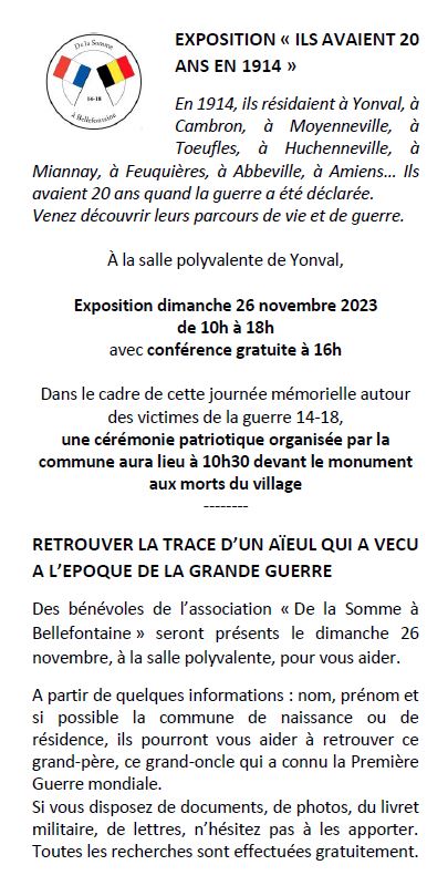En partenariat avec l’association « De la Somme à Bellefontaine », une exposition intitulée « ILS AVAIENT 20 ANS EN 1914 » est présentée au public de 10h à 18h dans la salle polyvalente de la commune. Plusieurs parcours de vie de jeunes hommes qui ont connu la Première Guerre mondiale, originaires de Yonval, de Moyenneville, d’Abbeville et d’autres communes du secteur, seront présentés.