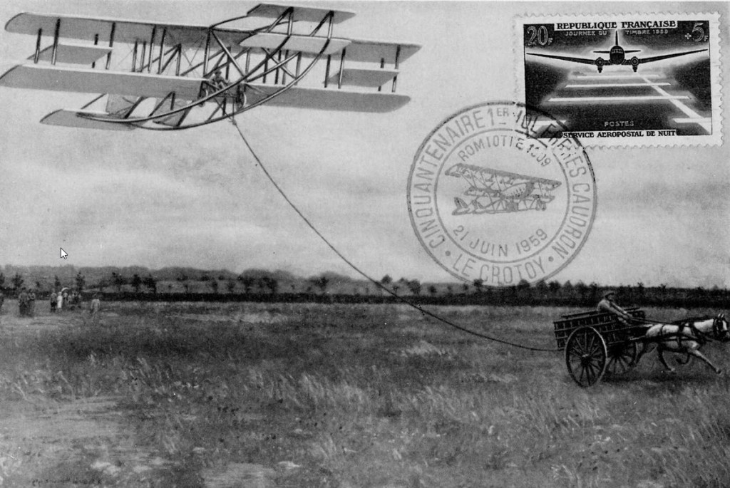 Carte postale éditée à l’occasion du cinquantenaire du premier vol des Frères Caudron à Romiotte en juin 1909 (AD Somme – 8FI5955)