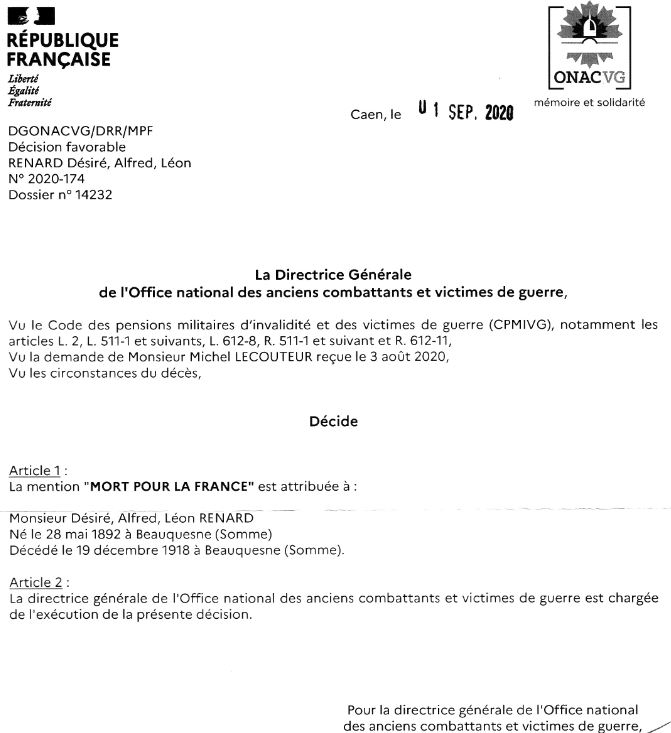 Cet oubli a été réparé suite à l’intervention de Michel LECOUTEUR, adhérent de l’association « De la Somme à Bellefontaine » auprès du Secrétariat d’Etat aux Anciens Combattants . Depuis le 1er septembre 2020, plus d’un siècle après son décès, Léon RENARD est officiellement reconnu « Mort pour la France ».