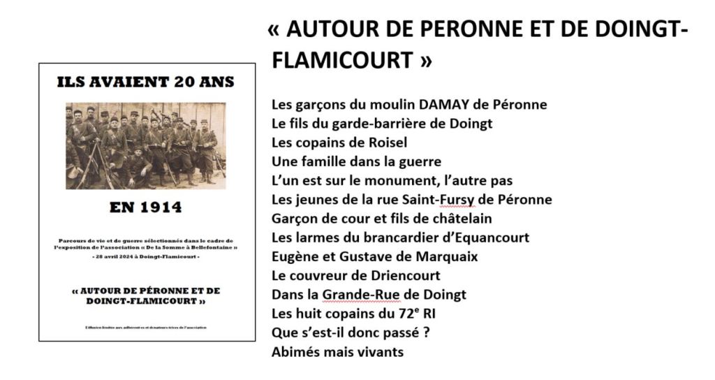 A l’occasion de cette exposition, une brochure spécifique « Autour de Péronne et de Doingt-Flamicourt » a été proposée aux visiteurs. Elle reprend quatorze parcours de vie de jeunes du secteur de Péronne qui avaient 20 ans en 1914 déjà publiés sur le site internet de l’association.