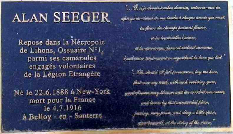 Un bombardement allemand ayant détruit les tombes de plusieurs soldats à Belloy-en-Santerre, parmi lesquelles la tombe d’Alan SEEGER, les débris osseux sont rassemblés et transportés dans un ossuaire du cimetière militaire de Lihons. Une stèle commémorative a été érigée en 2006 par le Souvenir Français.