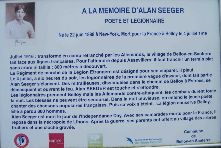 Le 4 juillet, au début de la Bataille de la Somme, Alan SEEGER trouve la mort à Belloy-en-Santerre, au lieu-dit « le Trou de l’Enfer » (en partie recouvert aujourd’hui par l’autoroute A1).