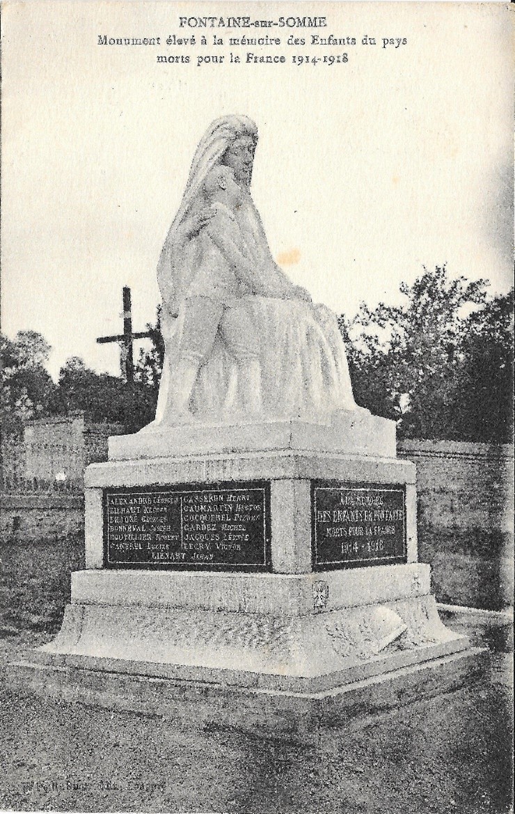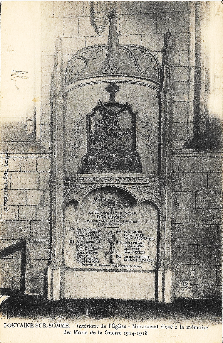 Sur le monument aux morts de Fontaine sur Somme son prénom est noté Jehan ainsi que sur celui à l’intérieur de l’Eglise et sur la plaque commémorative de la Mairie.