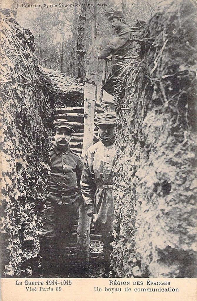 Il est incorporé au 132ème Régiment d’Infanterie le 18 décembre. Le régiment était caserné à Reims jusqu’au 2 septembre 1914, mais devant l’avancée allemande, il est déplacé à Guingamp (Côtes-d’Armor). Emile y effectue sa formation militaire et rejoint ensuite le front aux Eparges. Le régiment y livre bataille depuis le mois d’octobre, les pertes sont nombreuses de part et d’autre pour défendre la possession de la crête.
