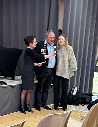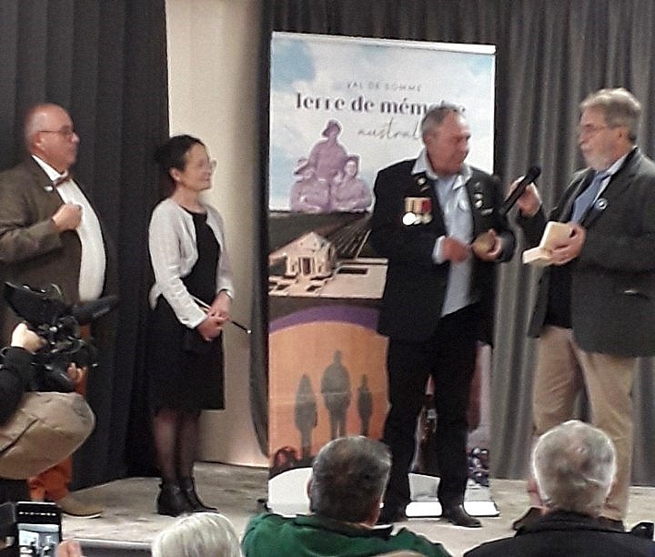 De retour à la salle polyvalente, il a alors été remis à Peter, par Monsieur Bardet, maire de la commune de Daours, la médaille de Citoyen d’honneur : distinction attribuée au soldat William Allan IRWIN par la Communauté de Communes du Val de Somme.