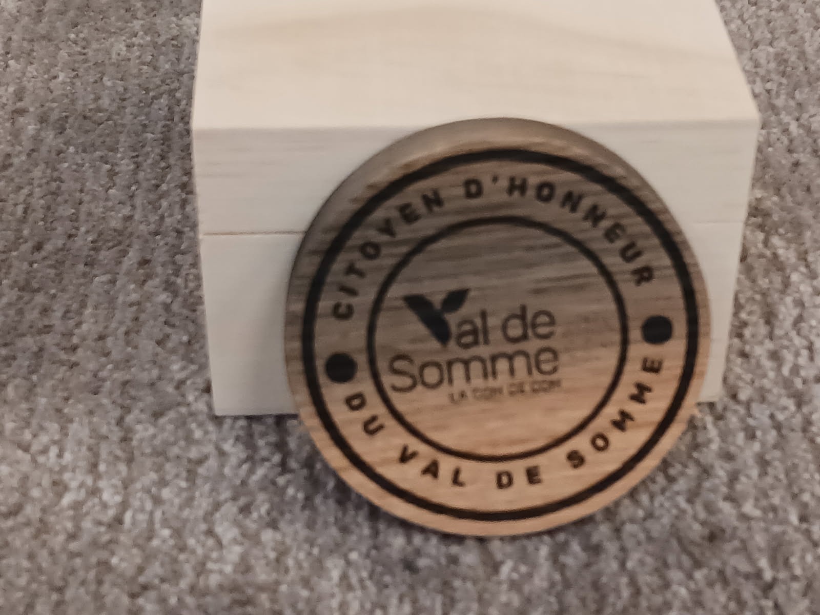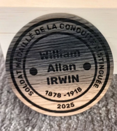 Cette médaille a été réalisée par un ébéniste local, à partir d’un bois de chêne centenaire qui portait des traces d’éclats d’obus encore visibles aujourd’hui.