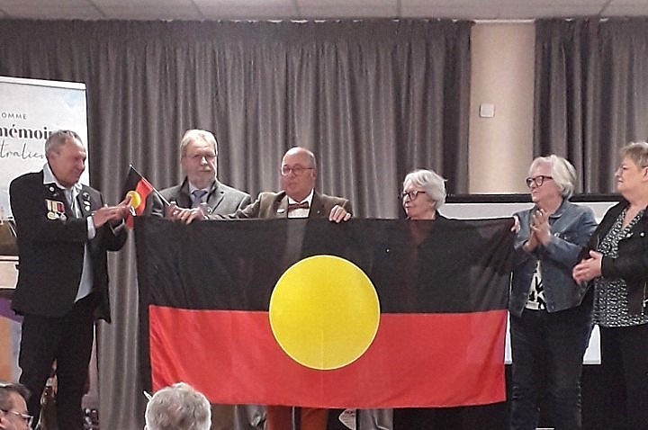 Peter MILIKEN, toujours aussi ému, a alors offert à Stéphane CHEVIN, vice-président à la Commission Tourisme de la Communauté de Communes du Val de Somme, le drapeau aborigène, en reconnaissance de son peuple.