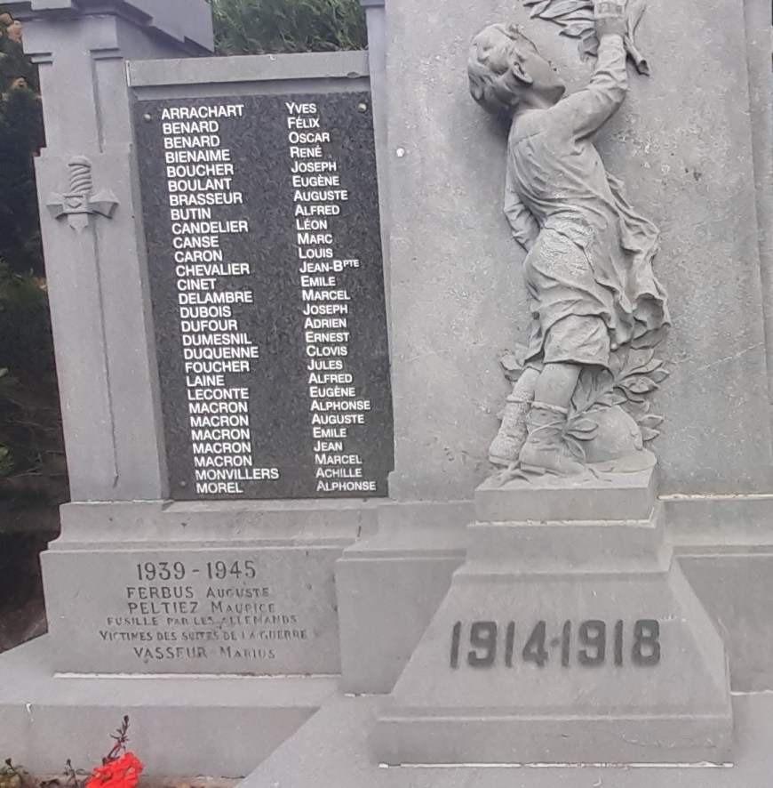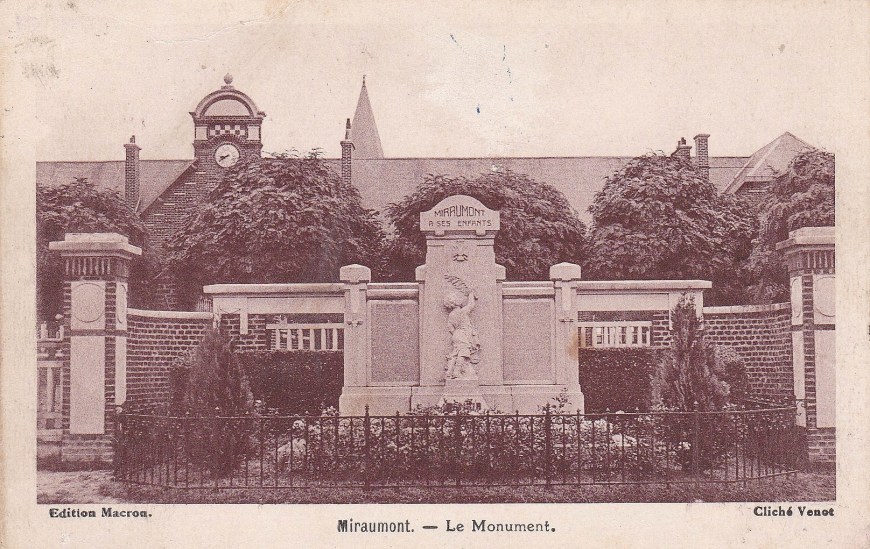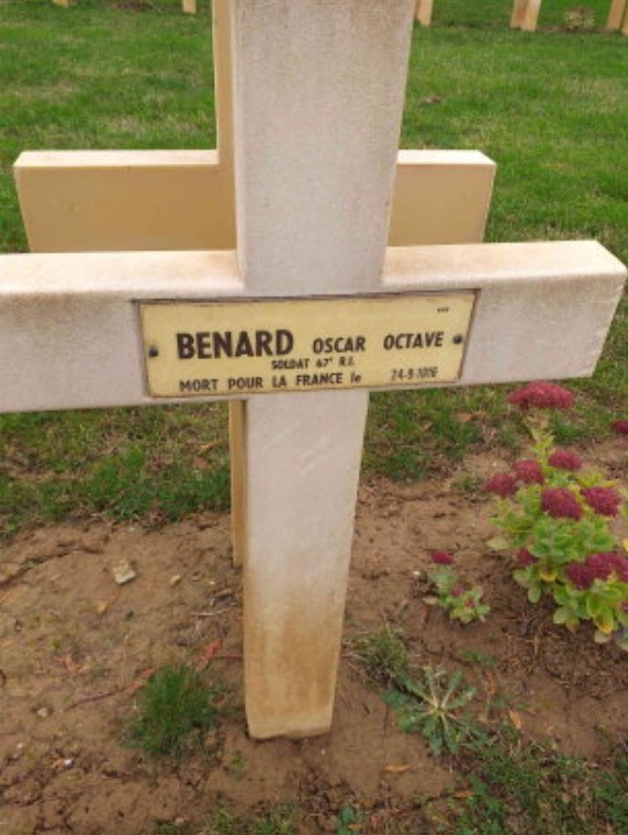 Le nom des deux frères BENARD, Oscar et Félix, sont inscrits l’un après l’autre, sur le Monument aux Morts de Miraumont, village où ils résidaient avant la guerre.
