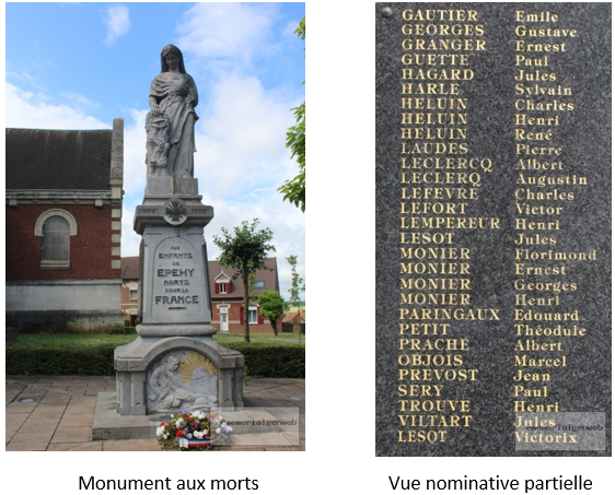 En revenant à Epehy, les habitants ont reconstruit sur les ruines. En 1931, les parents de Georges habitent dans la grande rue, Jules, le père, y est encore présent en 1936. Sur le monument aux morts d’Epehy, 4 soldats ont pour nom Monnier, (avec un ou deux N), tous sont « cousins », mais orthographiés différemment suivant les actes.