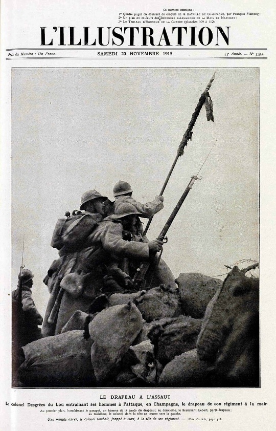 Le 6 avril 1915, après les nombreuses pertes du début de la guerre, tous les hommes doivent aller combattre en première ligne. Georges passe alors au 65ème RI, le régiment stationné à Nantes en août 14 est composé pour une grande partie de bretons et de vendéens et commandé par le colonel DESGREES DU LOU. Le régiment prend part à l’offensive d’Artois du printemps 1915 et gagne sa première citation à l’ordre de l’armée. En juillet, le régiment est relevé par les anglais, les régiments français se déplacent vers l’Est et le 65ème part vers la Champagne. Le 25 septembre 1915, c’est la seconde bataille de la Marne, lors d’une attaque dans le secteur de Mesnil-les-Hurlus, le colonel qui participe à l’assaut en tenant le drapeau du régiment est frappé à mort par les mitrailleuses ennemies. Là une du journal l’Illustration lui rendra hommage le 20 novembre 1915
