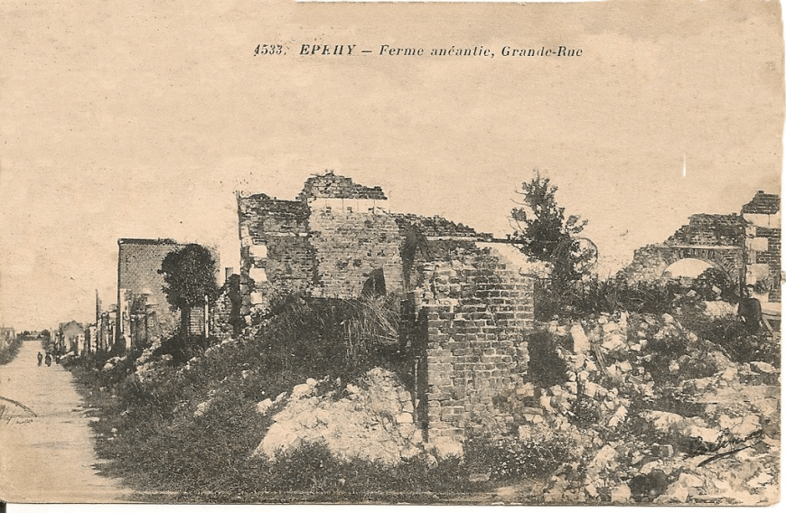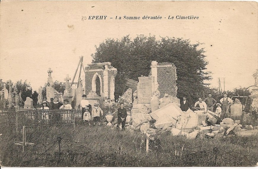 En 1921, Epehy n’a plus qu’un millier d’habitants, le village a été détruit par les bombardements, et surtout quand les Allemands ont reculé en pratiquant la politique de la terre brûlée en détruisant tout ce qu’ils pouvaient. Maisons détruites, arbres coupés, les populations des villages ont été regroupées puis déportées vers l’arrière du front. La commune recevra la croix de guerre en octobre 1920. Epehy a été occupé dès le 27 aout 1914 et ce jusqu’en mars 1917.