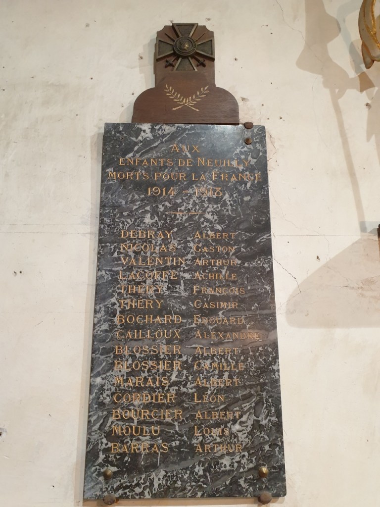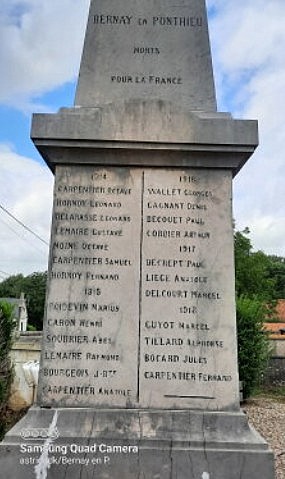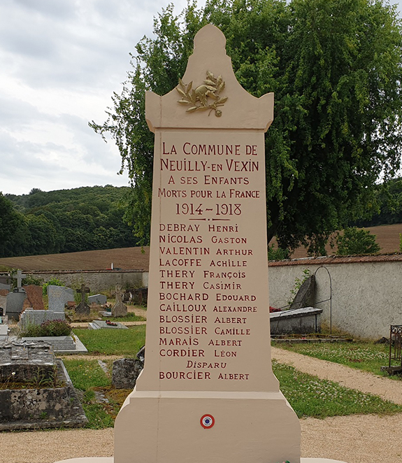 Le nom de CORDIER Arthur est gravé sur le monument aux morts de Bernay-en-Ponthieu, son village natal, ainsi que sur le monument et une plaque commémorative de l’Eglise Saint-Denis de Neuilly-en-Vexin, mais avec le prénom Léon.