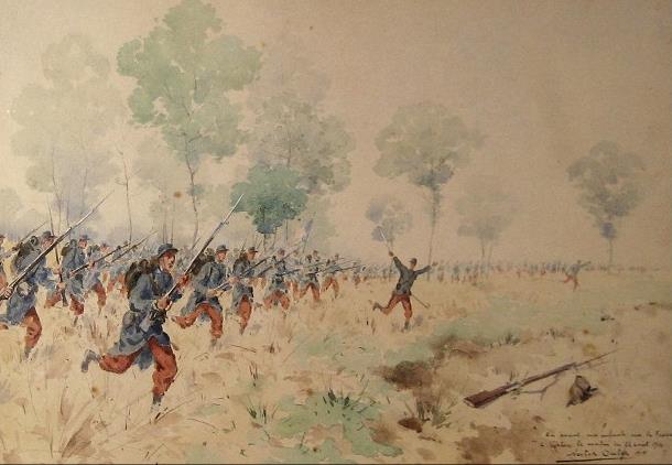 Une compagnie de Wurtembergeois envahit le marché de Virton et arrache le drapeau national du clocher. Mais vers le soir, des coups de feu éclatent. Les Allemands se retirent a toutes jambes vers les bois de Latour. Les Français sont entrés dans la ville. La population se croit sauvée. Cette scène à laquelle sont confrontésLire la suite 21 août 1914 : la marche en avant