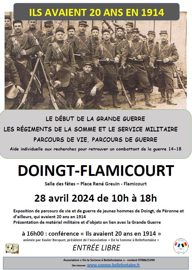 L’association « De la Somme à Bellefontaine » présente son exposition « Ils avaient 20 ans en 1914 » à Doingt-Flamicourt (commune partenaire de l’association) le dimanche 28 avril de 10h à 18h dans la salle des fêtes de Flamicourt. A travers les 50 panneaux d’exposition, les adhérents de l’association guideront les visiteurs dans les premiers mois de laLire la suite 28 avril : exposition et conférence à Doingt-Flamicourt