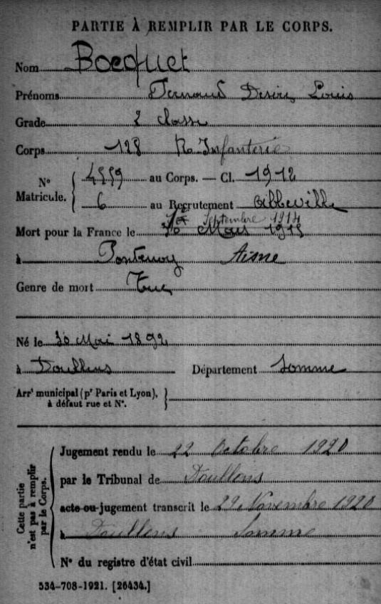 Fernand Désiré Louis BOCQUET est né le 30 mai 1892 à Doullens, dans la Somme. Fernand travaillait à la filature Syndeham.