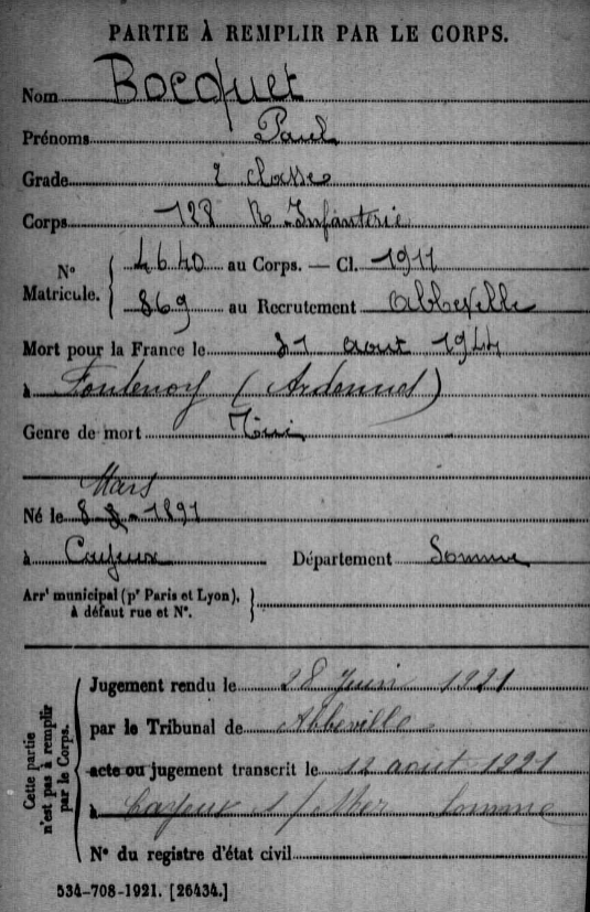 Incorporé au 128e RI pour y effectuer son service militaire (vraisemblablement en octobre 1912 – fiche matricule incomplète) , il a été tué le 31 août 1914 à Fontenois (Ardennes).