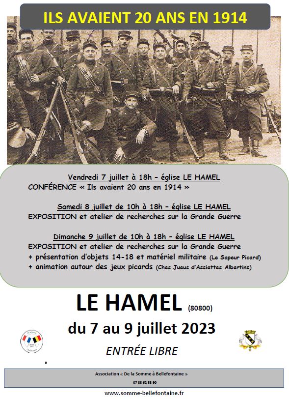 L’association « De la Somme à Bellefontaine » organise plusieurs animations le week-end du 7 au 9 juillet 2023 dans l’église de la commune de LE HAMEL (80800). Il s’agit d’un week-end mémoriel autour de la Première Guerre mondiale avec une conférence le vendredi 7 juillet à 18h intitulée “Ils avaient 20 ans en 1914” et uneLire la suite Week-end mémoriel à LE HAMEL